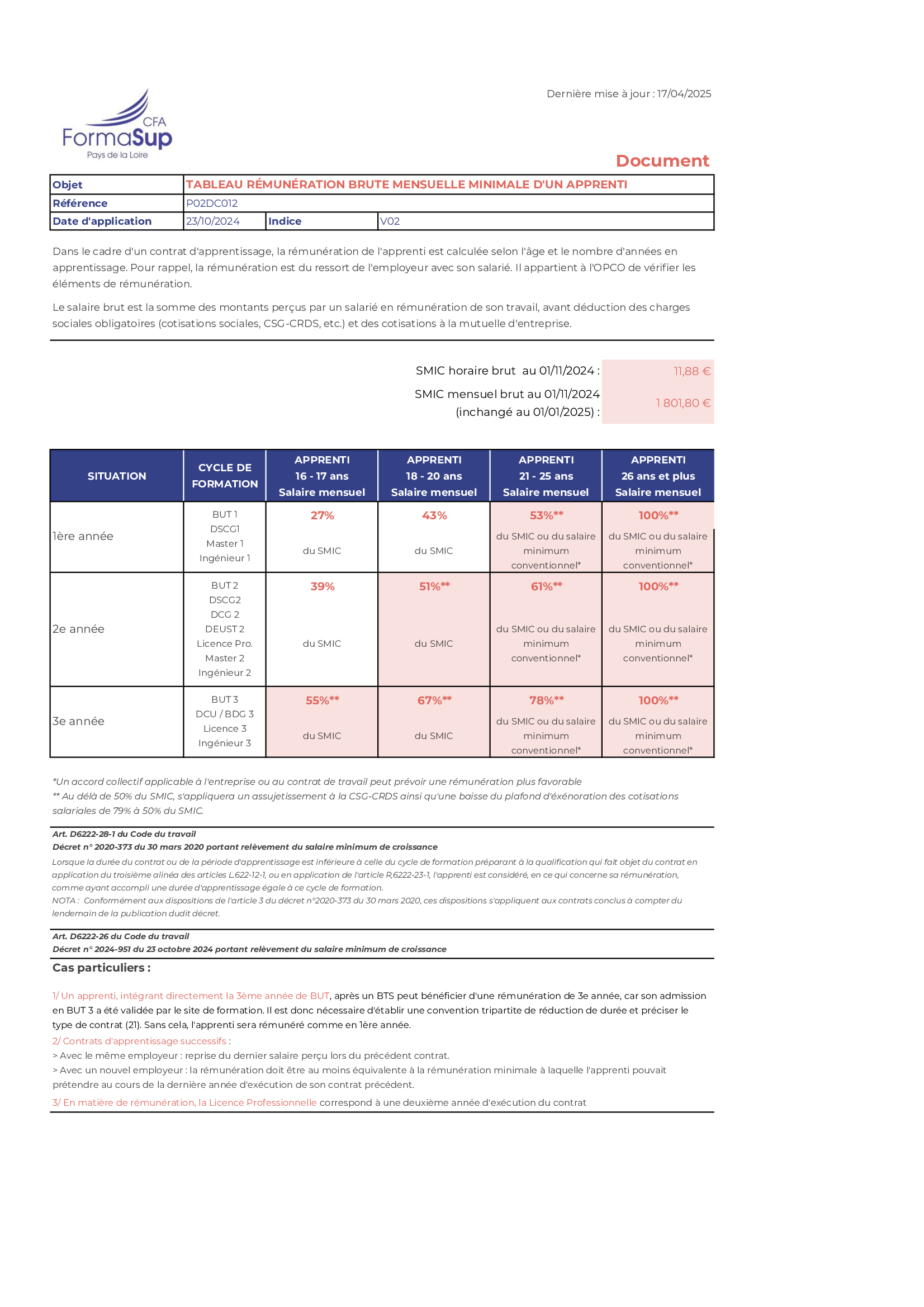 * Ces montants peuvent être majorés si un accord collectif applicable dans l’entreprise fixe une rémunération minimale plus élevée.